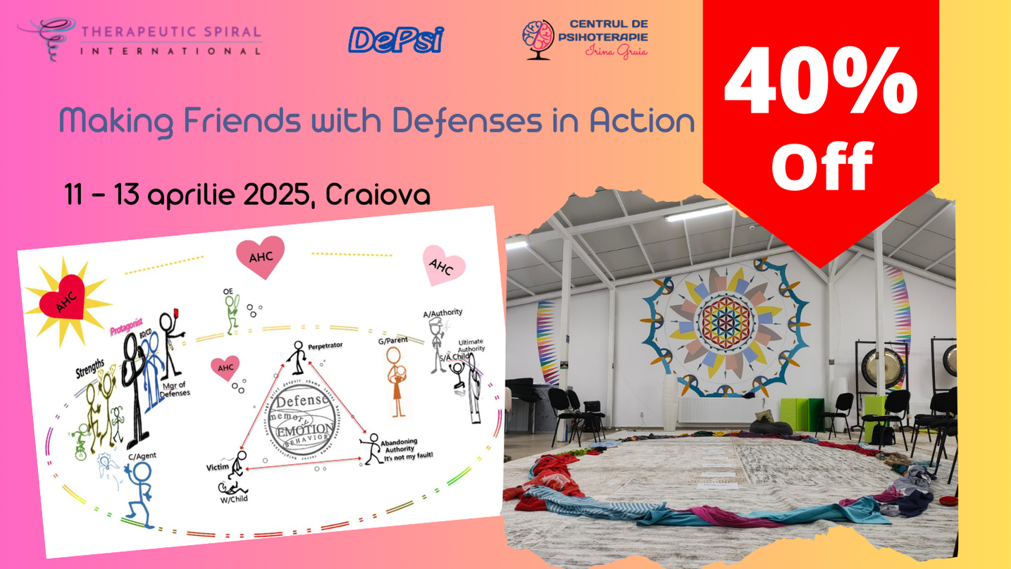 Te anunțăm cu entuziasm că al treilea workshop ce face parte din cele 4 ce compun nivelul 1 de formare Therapeutic Spiral Model, Making Friends with Defenses in Action (Devenind prieteni cu apărările în acțiune)” va avea loc în perioada 11 – 13 aprilie 2025.